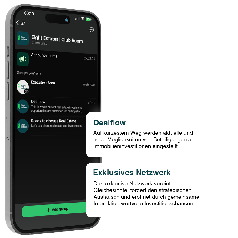 Nein, eine Investition ist nicht verpflichtend; die Community-Teilnahme eröffnet Zugang zu potenziellen Immobilieninvestments, dem Club Room sowie dem Austausch mit Gleichgesinnten.